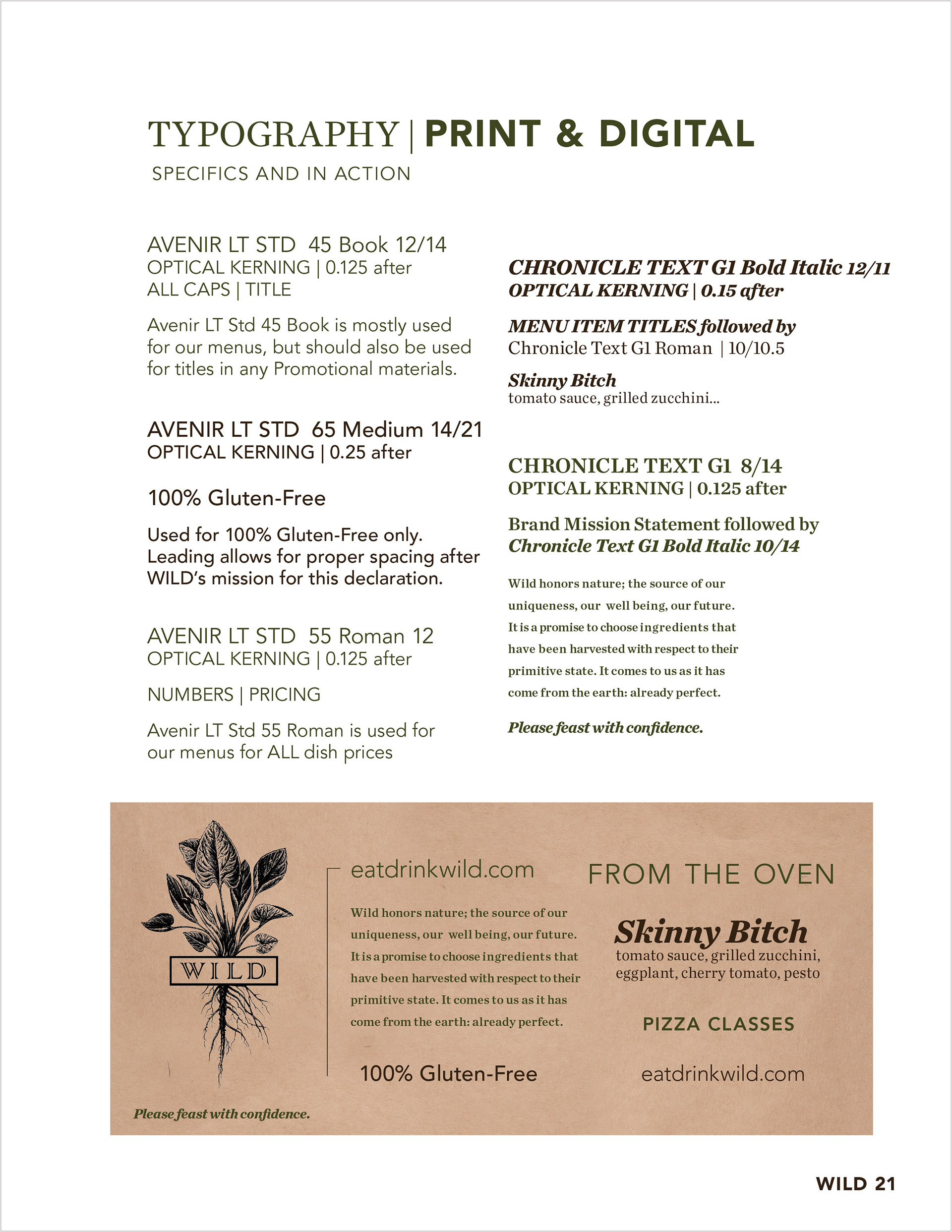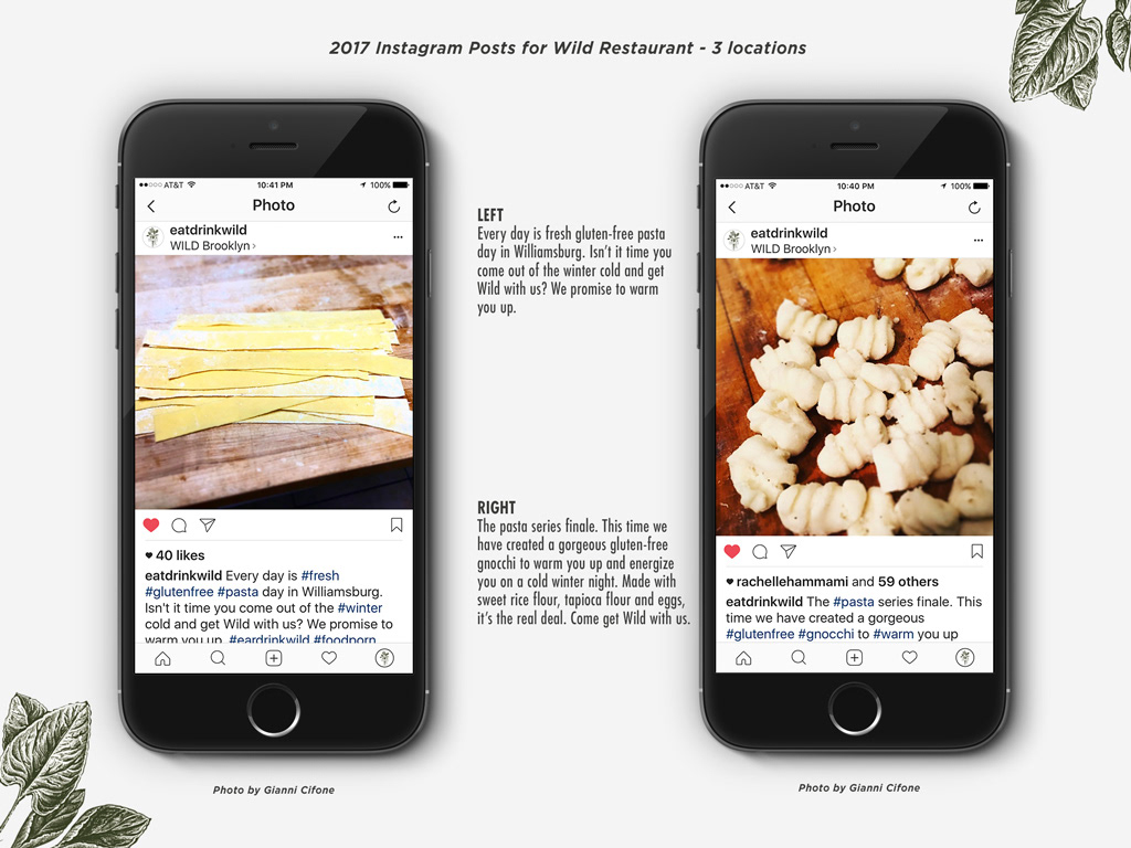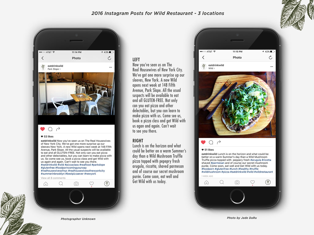 Wild Restaurant is a 100% gluten-free restaurant in New York City that I have been working with for the past two years handling the upkeep of the menus and promotional items as well as social media. The owners exclusively own two locations but in 2016, they made the bold decision to expand the business with their first franchise location opening in Park Slope, Brooklyn. The owners soon realized that they needed to set guidelines for franchise owners to follow. This is just a portion of the Wild's guidelines, which I have created to ensure everyone stays on-brand.